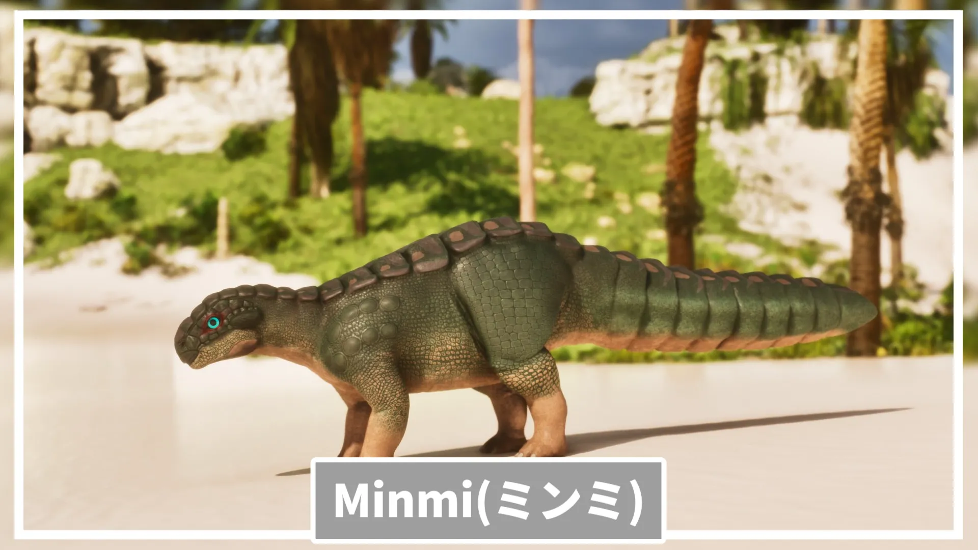 正式名称は「ミンミ(Minmi paravertebra)」。前期白亜紀に現在のオーストラリアに生息していた恐竜で、体長は約3mほど。アンキロサウルスの仲間で、背中や腹に硬い装甲を持っていたのが特徴です。(参考:Australian Museum「Minmi paravertebra」